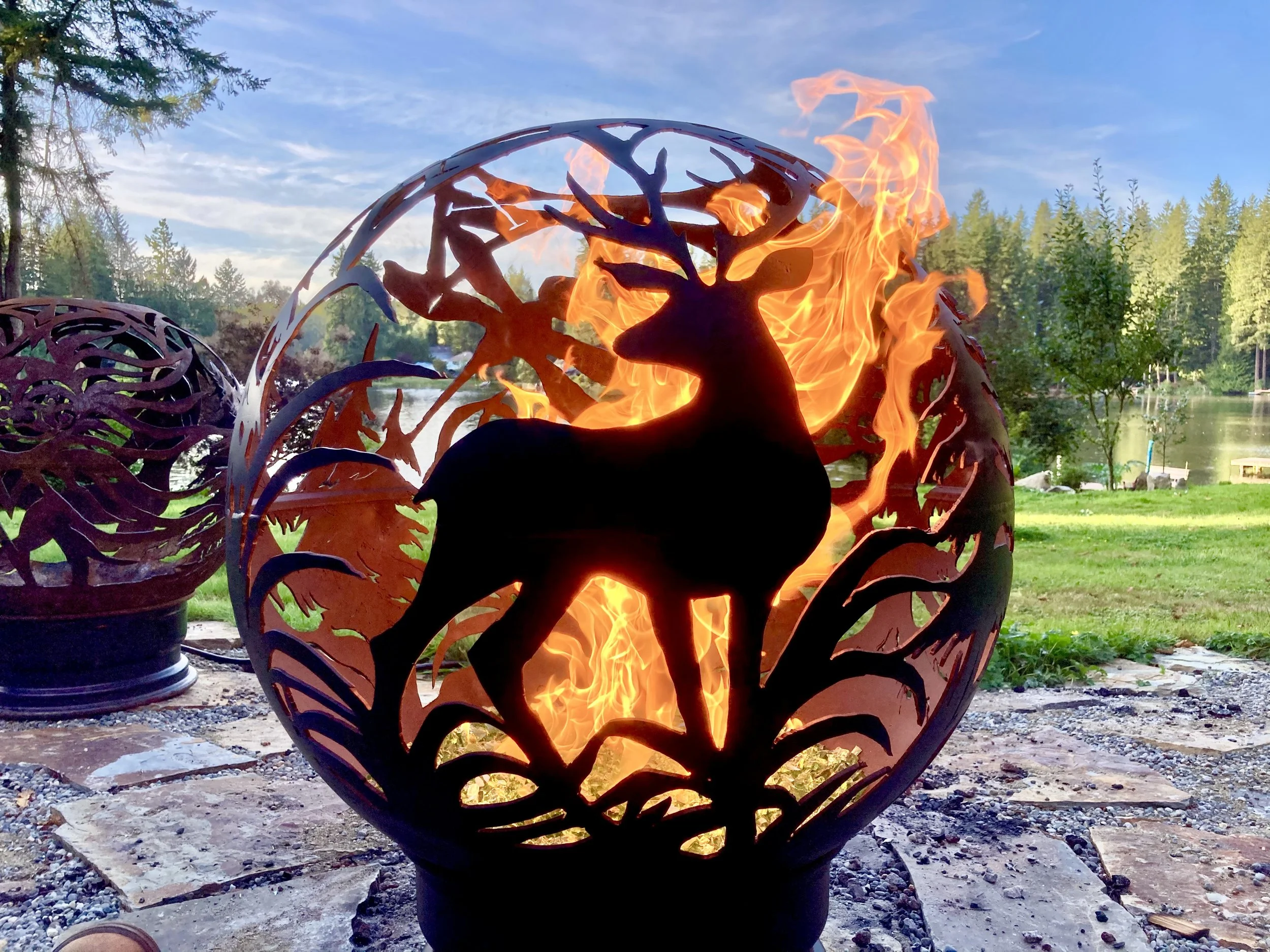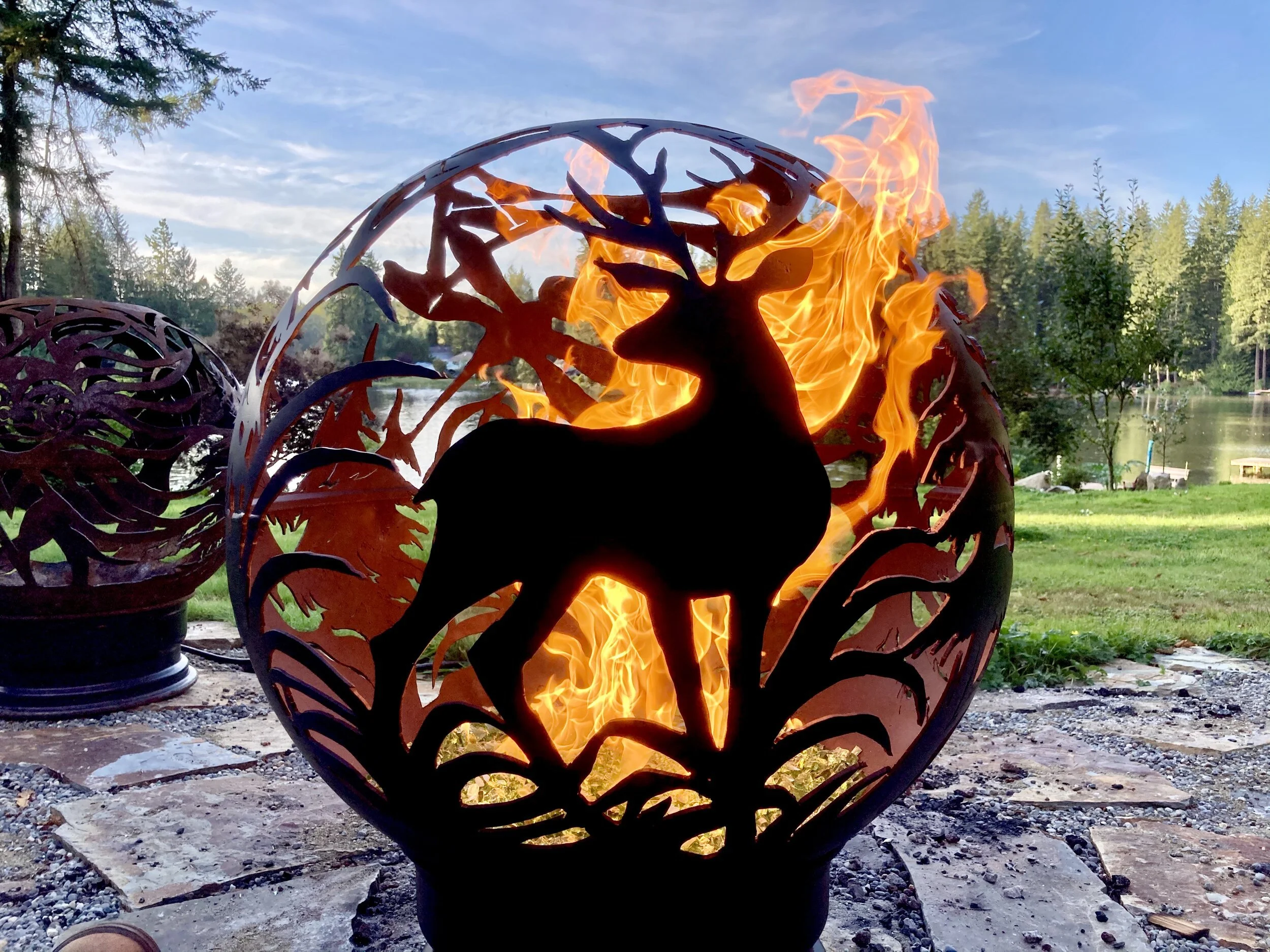 All Fireballs can be illuminated with firewood, propane or natural gas flames or electric lighting. All fireballs can easily swap between different illumination styles as desired.