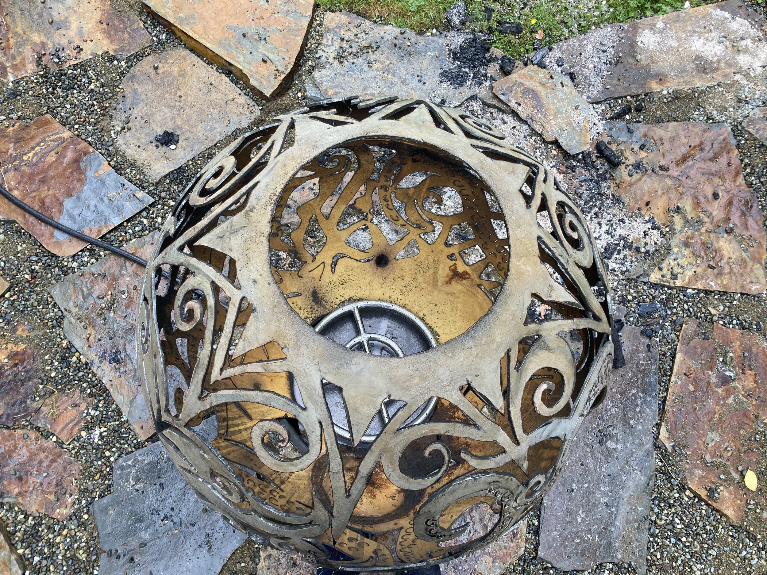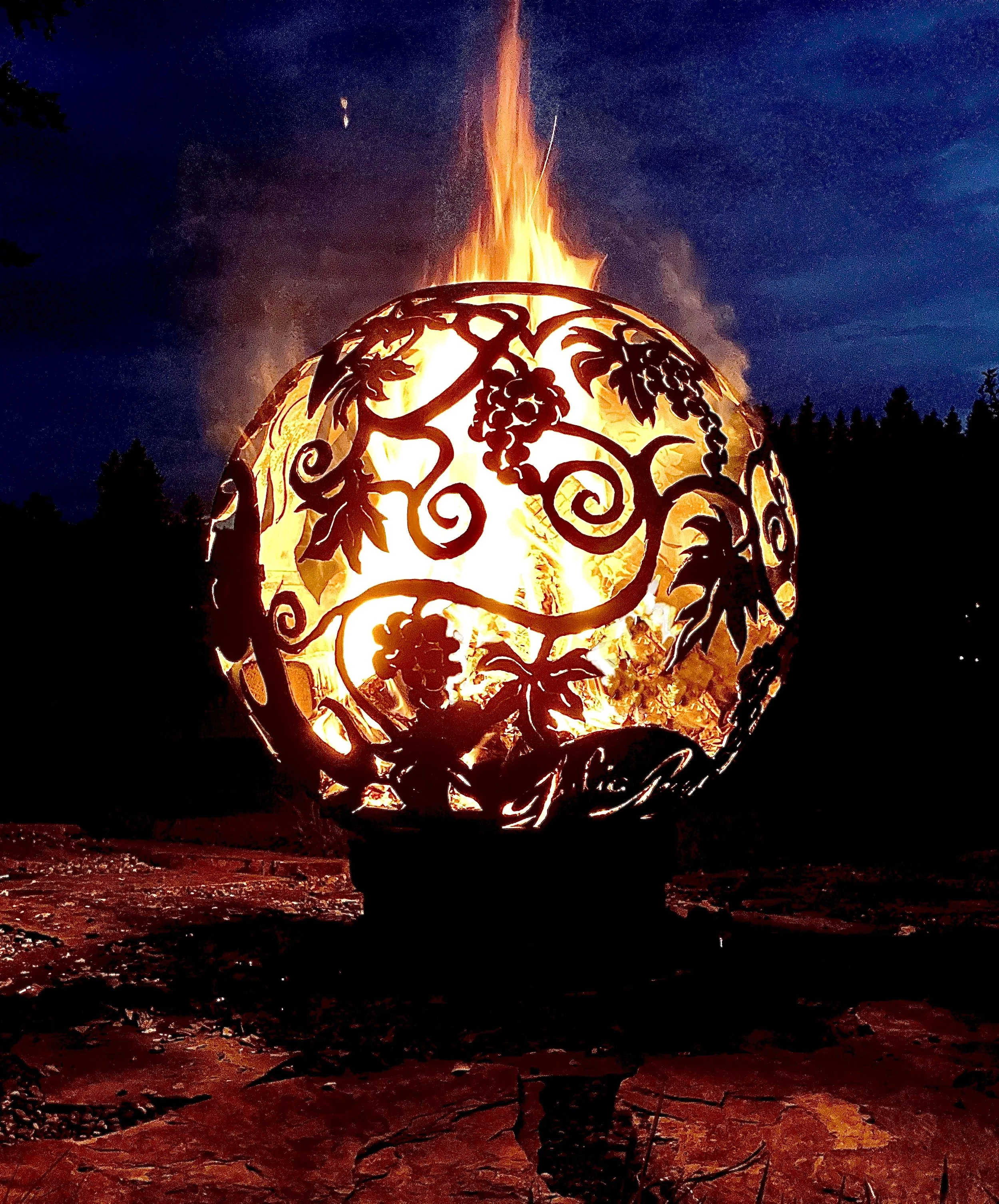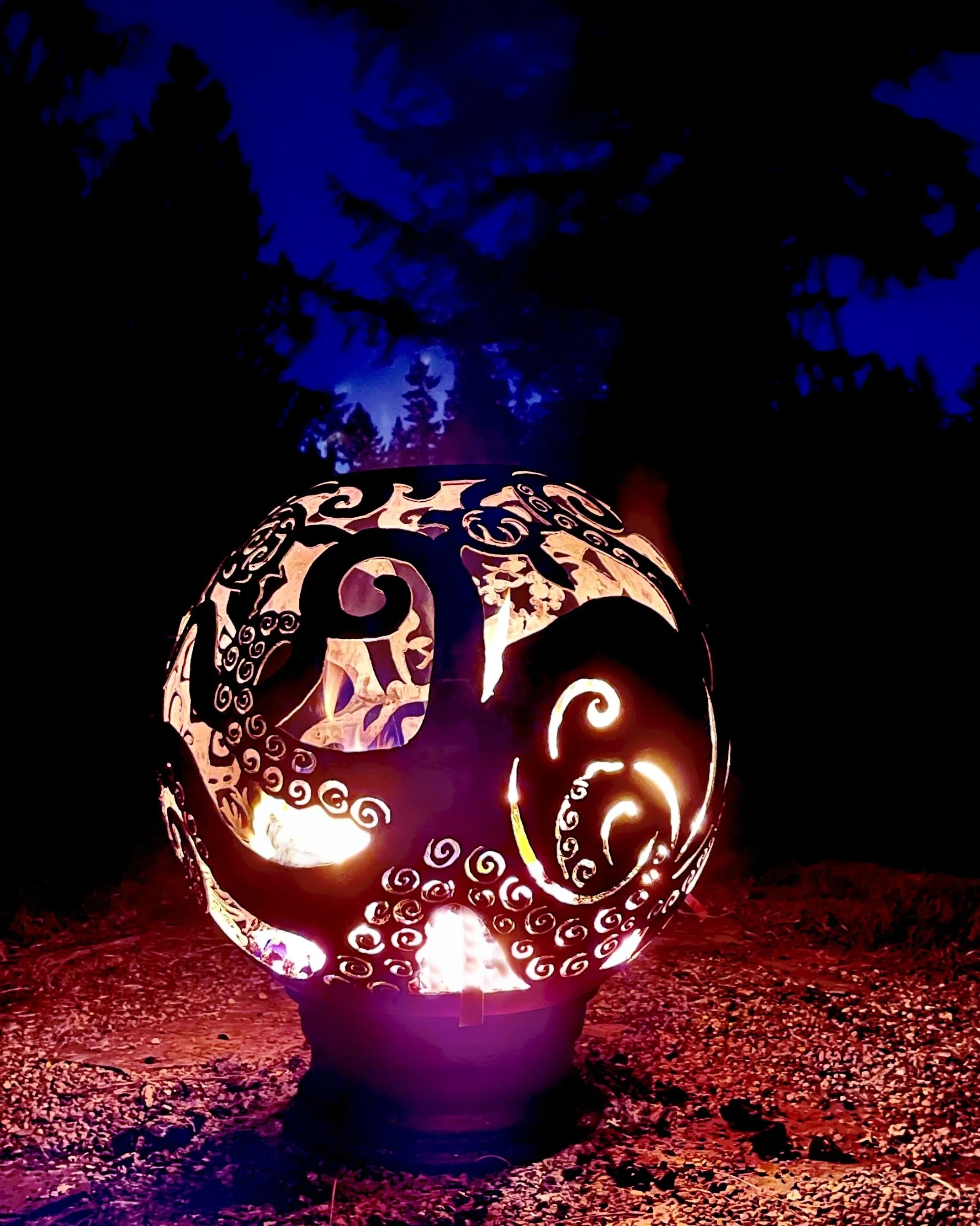 Building a fire inside a fireball is simple! You load some firewood and kindling or rolled up cardboard into the Fireball through the hole in the top. You can fill it to the top or just add some depending on how big a fire you want. You will light the fire with a long BBQ lighter through any hole in the design. The fire will draw oxygen through the holes in the design, essentially “fanning” the flames and creating a chimney effect. This means that a fire inside your Fireball usually burns hot with much less maintenance and effort than a traditional campfire. If your pieces of wood are large or somewhat damp adding a bit or lighter fluid may be helpful for getting it started.