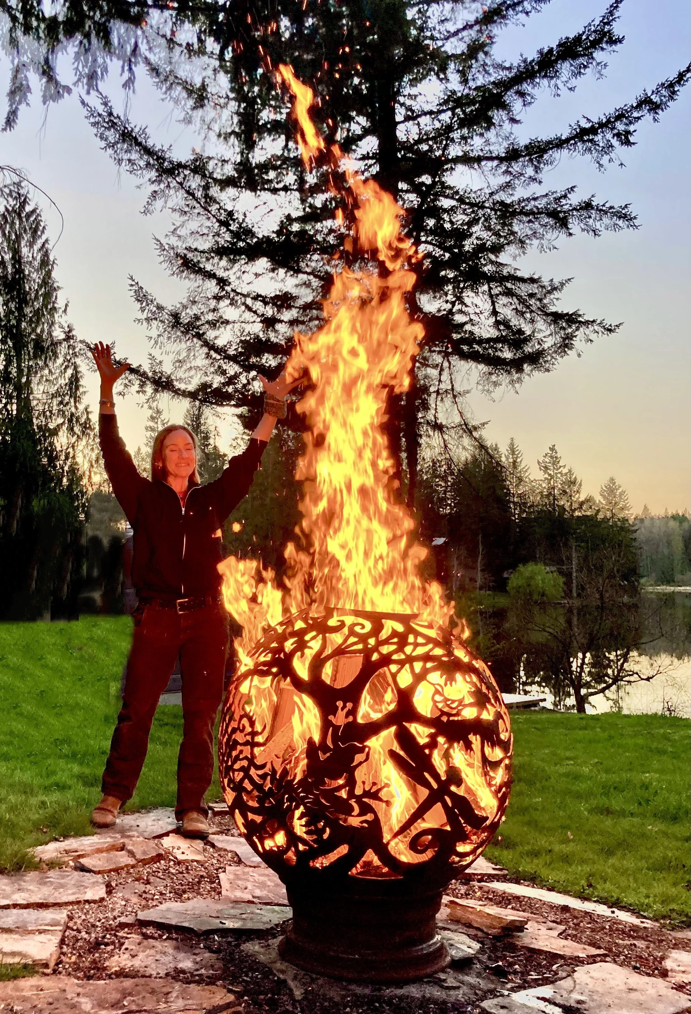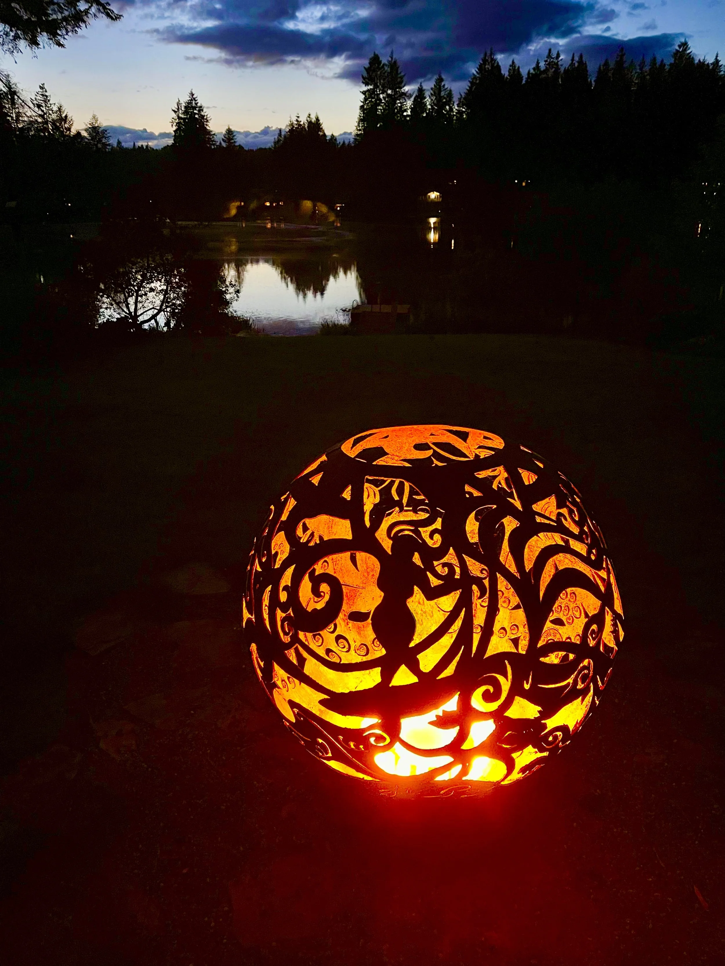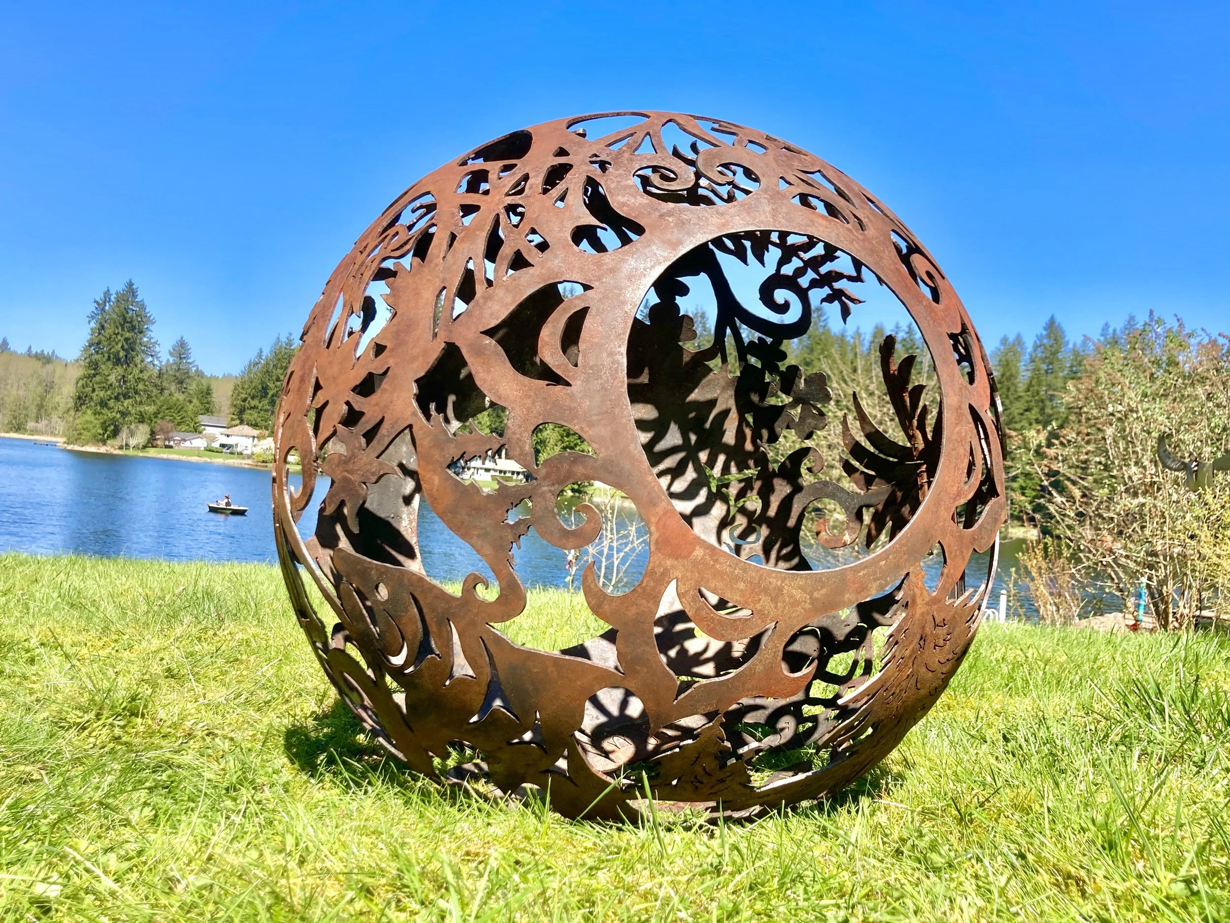 Building a fire inside a fireball is simple! You load some firewood and kindling or rolled up cardboard into the Fireball through the hole in the top. You can fill it to the top or just add some depending on how big a fire you want. You will light the fire with a long BBQ lighter through any hole in the design. The fire will draw oxygen through the holes in the design, essentially “fanning” the flames and creating a chimney effect. This means that a fire inside your Fireball usually burns hot with much less maintenance and effort than a traditional campfire. If your pieces of wood are large or somewhat damp adding a bit or lighter fluid may be helpful for getting it started.