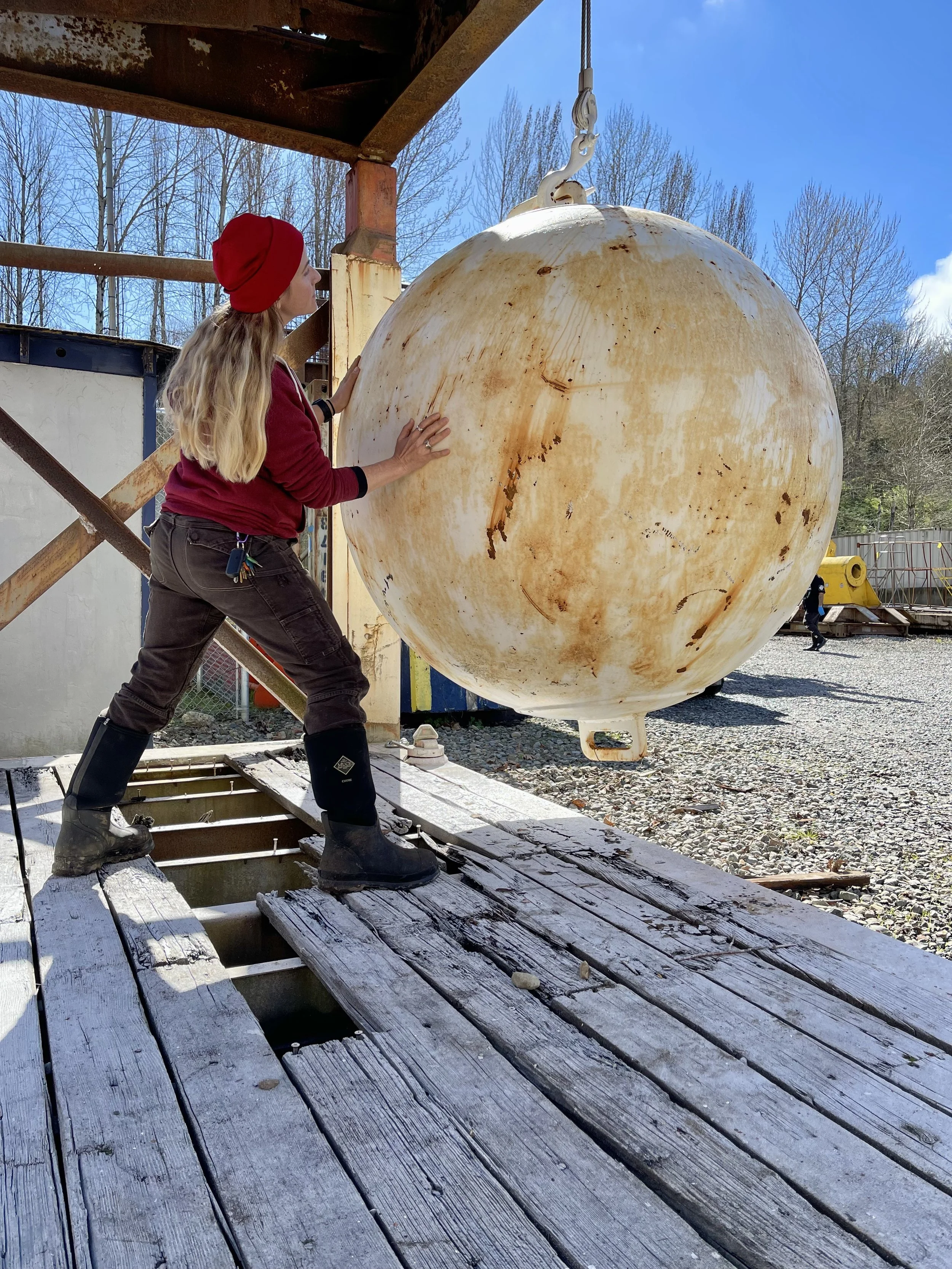 Julia plasma cutting a regular sized 30 inch Fireball out of a marine buoy.